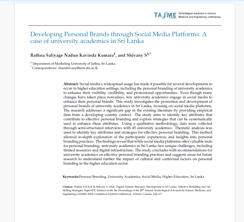 | Citation: | Rathna S.N.K.K & Shivany S, (2024). Developing Personal Brands through Social Media Platforms: A case of university academics in Sri Lanka, Abstract in the Proceedings of the 28th Annual Technological Advances in Science, Medicine, and Engineering (TASME 2024) Conference, Toronto, Canada. July 6-7.Page:40 . |